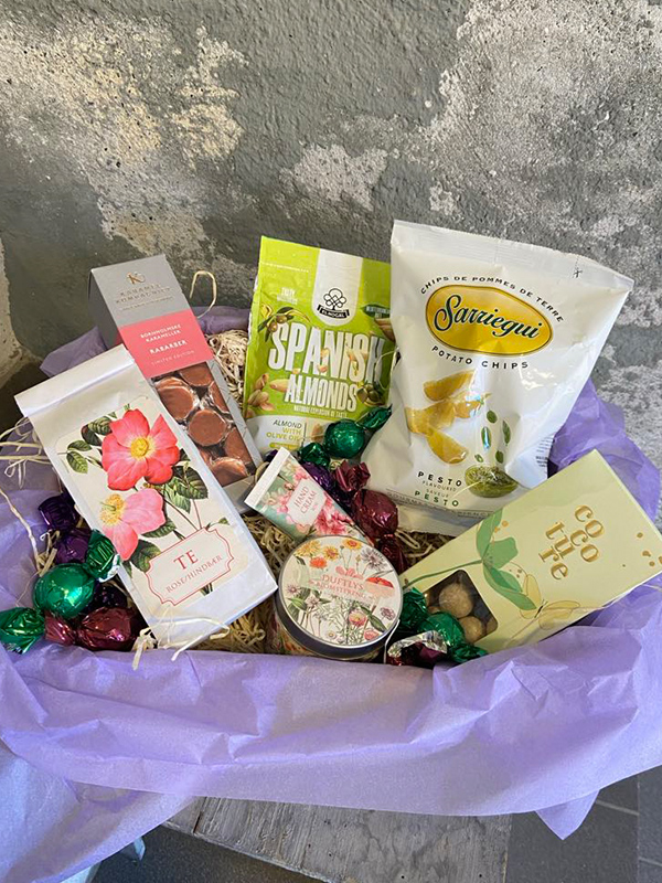 Mor’s Dags Kurv med specialiteter som chips / mandler / chokolade